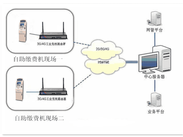 工業(yè)級4G路由器產(chǎn)品,可根據(jù)現(xiàn)場情況選擇2.5G/4G/有線的方式接入到物聯(lián)網(wǎng)平臺,建立VPN通道,接入自助繳費機中心服務(wù)器。中心服務(wù)器運行網(wǎng)管平臺和業(yè)務(wù)平臺實現(xiàn)對現(xiàn)場的網(wǎng)絡(luò)接入終端和自助繳費機終端遠(yuǎn)程管理。