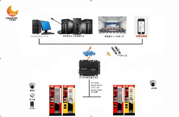 才茂3G/4G無線視頻終端設(shè)備能夠為售貨機無線數(shù)據(jù)傳輸應(yīng)用方案建立高速、穩(wěn)定的聯(lián)網(wǎng)與數(shù)據(jù)傳輸通道,將售貨信息、故障報警等通過4G無線視頻終端設(shè)備將信息傳送到監(jiān)控中心, 4G無線視頻終端設(shè)備收到監(jiān)控中心下發(fā)的命令并控制自動售貨機實現(xiàn)各種指令。同時,運營企業(yè)通過M2M云管理平臺能夠?qū)崿F(xiàn)對分散在不同地點的自助售貨終端進行統(tǒng)一的運行狀態(tài)監(jiān)管,有效降低企業(yè)的運維成本。 才茂公司根據(jù)所研發(fā)的產(chǎn)品有如下應(yīng)用方案: