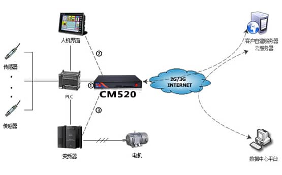 針對(duì)不同變頻器應(yīng)用場(chǎng)合和行業(yè),才茂變頻器遠(yuǎn)程監(jiān)控方案可以針對(duì)三種方式來進(jìn)行相應(yīng)的調(diào)整,第一種比較常見的方式是工業(yè)級(jí)無線路由器連接PLC設(shè)備,通過運(yùn)營商網(wǎng)絡(luò)和互聯(lián)網(wǎng)連接到數(shù)據(jù)中心平臺(tái),搭建起數(shù)據(jù)中心平臺(tái)與PLC的橋梁,這時(shí)數(shù)據(jù)中心平臺(tái)就能遠(yuǎn)程采集到PLC中獲取的傳感器信息、變頻器的頻率值等,同時(shí)也能通過PLC來遠(yuǎn)程更改變頻器工作頻率;第二種方式是工業(yè)級(jí)路由器連接人機(jī)界面設(shè)備(觸摸屏或者工控機(jī)),搭建數(shù)據(jù)中心平臺(tái)與人機(jī)界面設(shè)備的橋梁,同樣可以達(dá)到上述監(jiān)控目的,同時(shí)還能實(shí)現(xiàn)人機(jī)界面設(shè)備的故障查詢和程序更新;第三種方式是工業(yè)級(jí)無線路由器連接變頻器,搭建數(shù)據(jù)中心平臺(tái)與變頻器的橋梁,數(shù)據(jù)中心平臺(tái)可以實(shí)時(shí)查看變頻器的工作狀態(tài)和故障信息,同時(shí)可以遠(yuǎn)程更改變頻器工作頻率,這種方式只針對(duì)變頻器進(jìn)行設(shè)備監(jiān)控。三種遠(yuǎn)程監(jiān)控方式見如下圖2(3種方式分別標(biāo)注???):