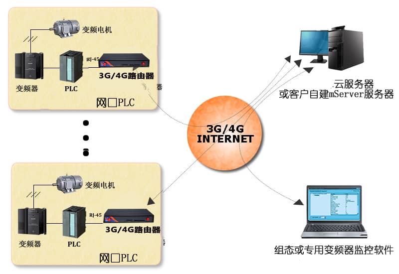 對(duì)于配合PLC使用的變頻器應(yīng)用,并且PLC具備RJ-45通信網(wǎng)口,使用TCP/IP協(xié)議實(shí)現(xiàn)通信的情況,如西門子、歐姆龍、三菱等網(wǎng)口的PLC。才茂目前已經(jīng)成功的連接國內(nèi)外大多數(shù)品牌具備網(wǎng)口的PLC產(chǎn)品,使用才茂網(wǎng)口通功能,配合云服務(wù)器,只需要極少的配置工作,無需已有的監(jiān)控軟件做二次開發(fā),即可快速實(shí)現(xiàn)遠(yuǎn)程無線通信功能。詳細(xì)請(qǐng)見才茂3G路由器連接PLC的技術(shù)文檔。結(jié)構(gòu)圖如下圖: