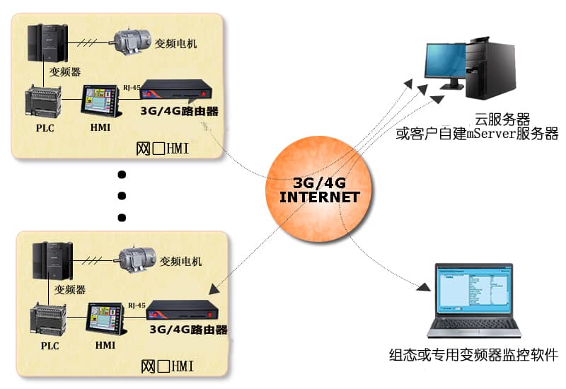 對(duì)于配合PLC和人機(jī)界面HMI一起使用的變頻器應(yīng)用,而且HMI具備RJ-45網(wǎng)口,如西門子的觸摸屏。對(duì)于具備網(wǎng)口的HMI產(chǎn)品,使用才茂網(wǎng)口通功能,配合云服務(wù)器,只需要極少的配置工作,無需已有的監(jiān)控軟件做二次開發(fā),即可快速實(shí)現(xiàn)遠(yuǎn)程無線通信功能。結(jié)構(gòu)圖如下圖: