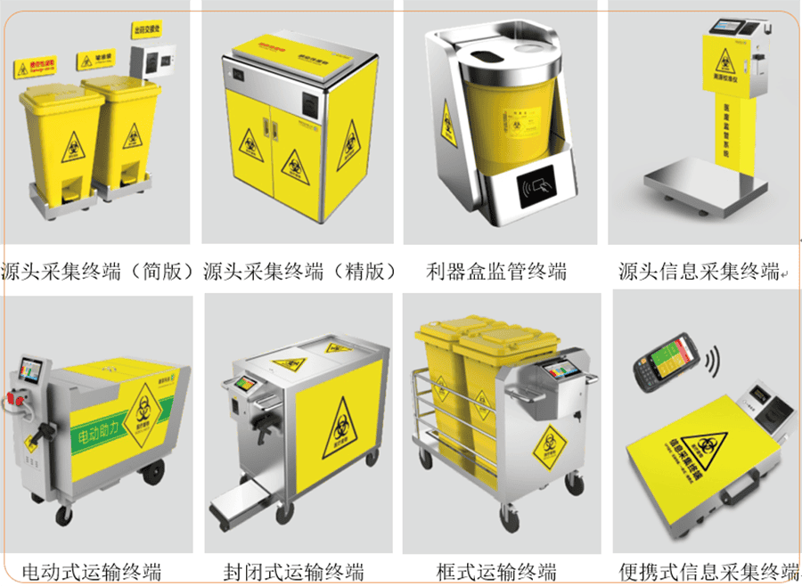 根據(jù)用途和使用場景的不同,硬件產(chǎn)品可分為源頭信息采集終端、利器盒監(jiān)管終端、信息采集運輸終端、便攜式信息采集終端四類;源頭信息采集終端具備感應(yīng)開門、只進不出,滿溢報警,刷卡開門、授權(quán)清運,自動稱重、自動出馬;自動上傳至云端平臺;利器盒監(jiān)管終端:智能鎖定、以防丟失,一人一卡,身份識別,專桶專用、權(quán)限開門;源頭信息采集終端:7寸觸摸屏,掃碼識別核對數(shù)據(jù),熱敏打印、自動出碼,自動稱重,數(shù)據(jù)上傳;信息采集運輸設(shè)備:掃碼登入、單方權(quán)限,GPS定位,顯示軌跡,掃碼識別,核對數(shù)據(jù),自動稱重,自動出碼。