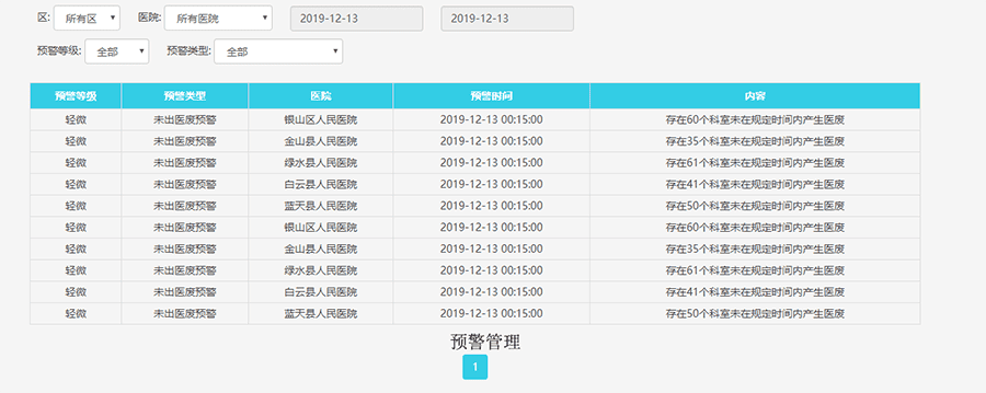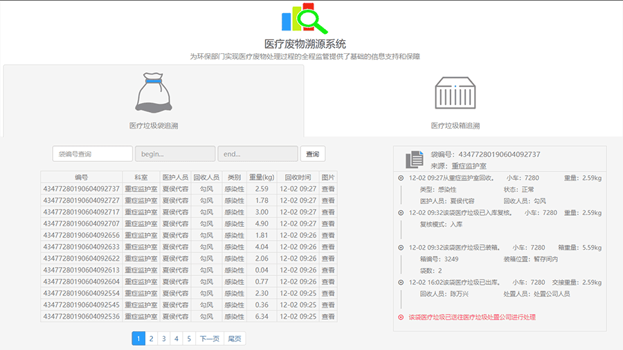 醫(yī)療廢物閉環(huán)監(jiān)管系統(tǒng)平臺具備醫(yī)廢追溯管理、科室交接管理、清運人員工作量統(tǒng)計、醫(yī)廢報表、醫(yī)廢定位等功能;其中醫(yī)廢追溯管理對每天的醫(yī)療廢物收集處置現(xiàn)場可實時查看,登記的信息簡單直觀可查,及時發(fā)現(xiàn)問題,解決問題;醫(yī)廢桶定位可以實時了解廢物的滿桶情況,及時通知對應(yīng)的樓層清運人員進行收集,以免醫(yī)療廢物滿溢;醫(yī)廢報表是一份完整的數(shù)據(jù)分析及數(shù)據(jù)報表系統(tǒng),方便分管領(lǐng)導(dǎo)精準快捷的核對醫(yī)廢處置信息,確保醫(yī)廢不流失。