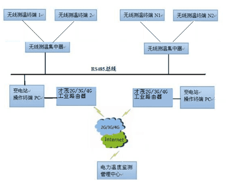 測溫系統(tǒng)由無線測溫終端、無線測溫集中器、才茂無線2G/3G/4G 路由器傳輸模塊和上層溫度監(jiān)測管理中心構(gòu)成。無線測溫終端負(fù)責(zé)對高壓開關(guān)柜內(nèi)的溫度進(jìn)行采集,并負(fù)責(zé)對數(shù)據(jù)的接收、處理,并通過RS485總線將數(shù)據(jù)傳輸給監(jiān)控計(jì)算機(jī)。監(jiān)控計(jì)算機(jī)軟件采用C#編程,實(shí)現(xiàn)監(jiān)測數(shù)據(jù)的顯示和數(shù)據(jù)庫的訪問,以便集中管理和最優(yōu)控制。同時將監(jiān)控計(jì)算機(jī)所采集到的溫度數(shù)據(jù)利用才茂無線2G/3G/4G 路由器遠(yuǎn)程傳輸?shù)缴蠈訙囟缺O(jiān)測管理中心,并在溫度監(jiān)測管理中心計(jì)算機(jī)中進(jìn)行顯示、存儲、分析與報警。