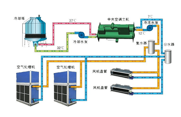 通過遠程監(jiān)控中心,設(shè)備廠商/工程商能夠第一時間了解分布在全國各地的中央空調(diào)機組的運行狀況,其中可包括機組的當前運行數(shù)據(jù)、設(shè)定數(shù)據(jù)等,并迅速、準確地向用戶提出專業(yè)的建議;同時也能全天候地偵測各地用戶的設(shè)備運行狀態(tài)、故障報警等,幫助用戶和廠商維護人員及時排除故障,恢復(fù)機組的正常使用。下圖是中央空調(diào)工作原理圖: