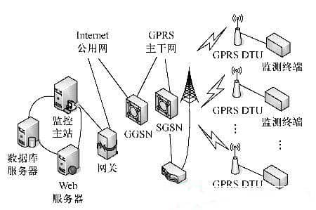 監(jiān)測(cè)終端通過(guò)自身裝配的GPRS 無(wú)線模塊(GPRS DTU)接入GPRS 網(wǎng)絡(luò),再通過(guò)GPRS 無(wú)線網(wǎng)絡(luò)連接到Internet 公用數(shù)據(jù)網(wǎng),繼而連接到監(jiān)控主站,將數(shù)據(jù)送監(jiān)測(cè)主站作進(jìn)一步分析和處理。