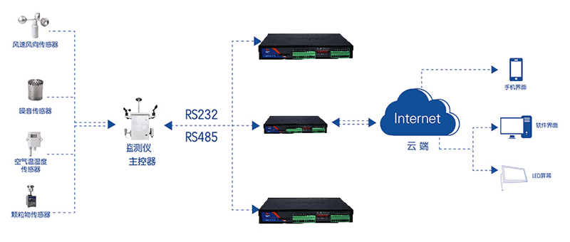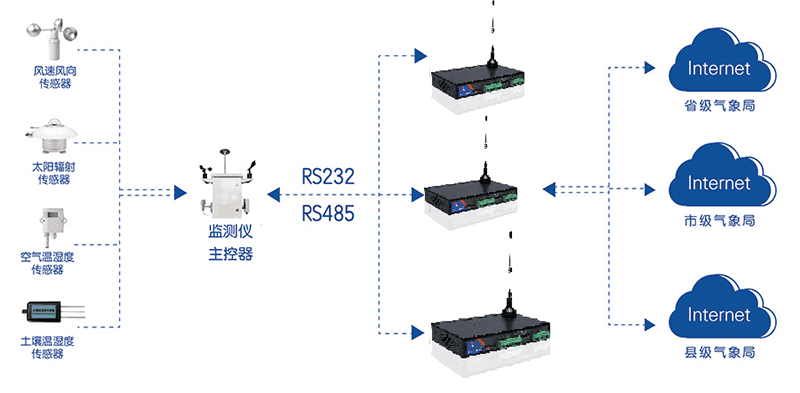 各監(jiān)控點使用4G透明數(shù)據(jù)傳輸終端,通過移動4G網(wǎng)絡(luò)與監(jiān)控中心相連。各污染源數(shù)據(jù)采集點使用移動通信公司統(tǒng)一的卡,同時監(jiān)控中心對各點進行登記,保存相關(guān)資料以便識別和維護處理。各信息采集點運行監(jiān)控系統(tǒng)軟件,支持24小時實時在線,實現(xiàn)信息采集點24小時傳送采集的環(huán)保信息數(shù)據(jù)。