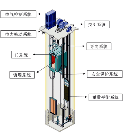 電梯是機(jī)械與電氣緊密結(jié)合的大型機(jī)電產(chǎn)品,主要有機(jī)房、井道、轎廂、導(dǎo)向、曳引、安全保護(hù)系統(tǒng)、重量平衡系統(tǒng)、門(mén)系統(tǒng)、電力拖動(dòng)系統(tǒng)和電氣控制系統(tǒng)等組成。