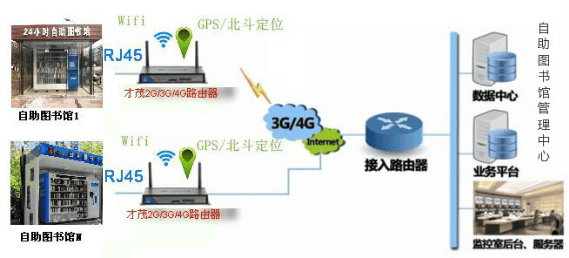 自助圖書館無線數(shù)據(jù)應(yīng)用拓?fù)鋱D(才茂2G/3G/4G路由器+wifi+GPS定位)