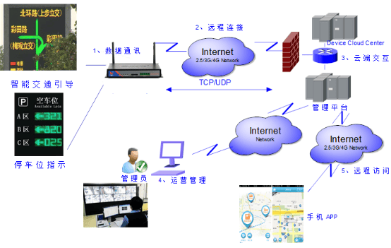 ◆停車場(chǎng)信息采集終端與中央管理系統(tǒng)之間的車位數(shù)據(jù)通信以及中央管理系統(tǒng)與誘導(dǎo)屏之間的通信,由于誘導(dǎo)屏安裝在道路路側(cè),不便于敷設(shè)通信電纜,因此建議均采用無(wú)線通訊手段,實(shí)現(xiàn)系統(tǒng)內(nèi)的數(shù)據(jù)通訊,如我們采用的3G/4G網(wǎng)絡(luò)。