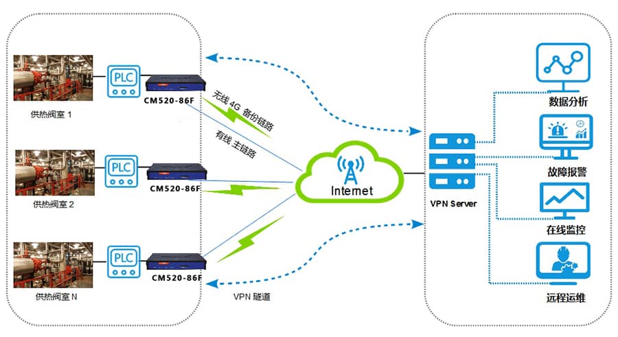 供熱管網(wǎng)各供熱子站日常巡檢的運(yùn)行狀態(tài)數(shù)據(jù),例如進(jìn)入水溫度,出水溫度,壓力,壓縮機(jī)運(yùn)行狀態(tài),漏水,溫度閥值,啟動狀態(tài),報警的相關(guān)數(shù)據(jù),從PLC自動化控制系統(tǒng)中,通過CM520-86F無線網(wǎng)關(guān)發(fā)送到熱力公司數(shù)據(jù)中心。CM520-86F與數(shù)據(jù)中心建立VPN,將數(shù)據(jù)中心與供熱閥室進(jìn)行無縫隙的聯(lián)網(wǎng),實現(xiàn)數(shù)據(jù)的雙向訪問,中心可以及時調(diào)取各個供熱閥室的各種數(shù)據(jù)。有線光纖線路為現(xiàn)場網(wǎng)絡(luò)接入的主鏈路,無線4G網(wǎng)絡(luò)作為備份鏈路。的鏈路備份功能為網(wǎng)絡(luò)健壯性、穩(wěn)定性提供了可靠的解決方案。通過VPN網(wǎng)絡(luò)實現(xiàn)了端到端的安全數(shù)據(jù)傳輸,同時完成對整個供熱運(yùn)行的監(jiān)測與自動控制,實現(xiàn)“換熱站無人值守”!
