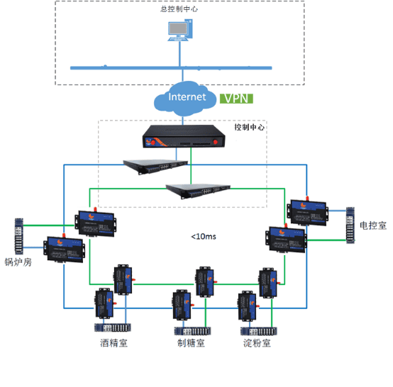 這套自動化控制系統(tǒng)需要監(jiān)控生產(chǎn)線上的各個環(huán)節(jié),包括鍋爐房、電控室、酒精室等。一條生產(chǎn)線上的每個操作工序都有一臺PLC,系統(tǒng)需要組建一個工業(yè)冗余網(wǎng)絡(luò),將PLC的數(shù)據(jù)通過網(wǎng)絡(luò)傳輸至控制室,從而便于工作人員可以在控制中心隨時查看并了解生產(chǎn)線上設(shè)備的實時狀態(tài)。