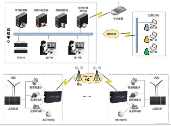 水利無線監(jiān)控系統(tǒng)通過4G網絡進行數(shù)據傳輸,通過太陽能、風能進行供電,可輕松解決水利監(jiān)控傳輸、供電等難題,可實現(xiàn)對堤壩環(huán)境、水位情況進行實時遠程監(jiān)控,發(fā)現(xiàn)汛情時觸發(fā)報警,通過聲光、短信等方式通知管理人員,可及時采取防汛措施,保證水壩及周邊人民的生命財產安全,減少或避免不必要的損失。