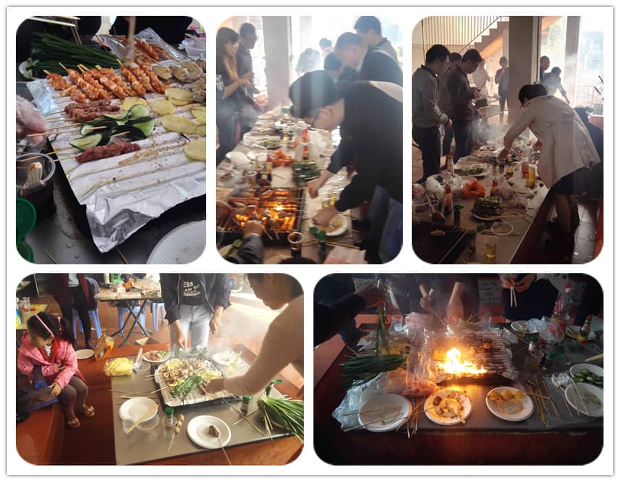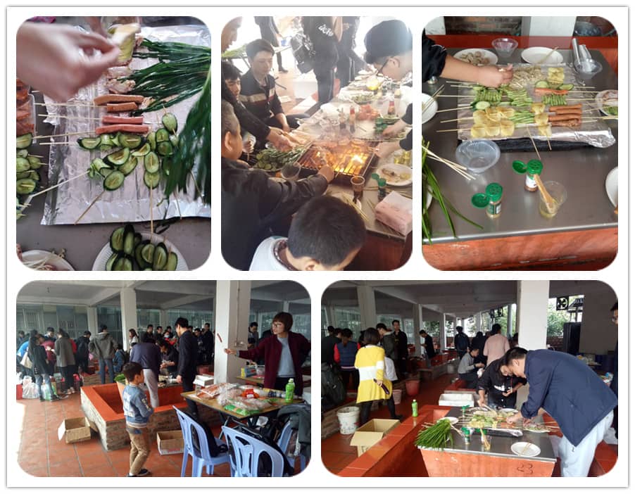 上午11點半大家開始了本次活動的主題項目---燒烤。大家火速分工,有的生火,有的切肉,有的穿肉.......忙的不意樂乎,各自拿出了自己“十八班武藝”,烤雞翅,烤肉串,烤土豆片。雖然偶有焦黑,但是多數(shù)情況下,還是“合格產(chǎn)品。大家所烤出來的雞翅,外焦里嫩,香甜可口, 盡管大家熱的滿頭大汗,當品嘗著自己的勞動成果時,大家都覺得味道非常好。大家爭著、搶著,都想露一手,畫面是如此的自然、和諧,卸去了往日的工作壓力,有的只是那一張張開心的笑臉。