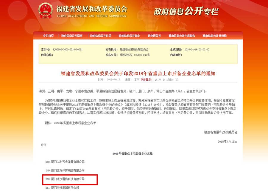 才茂通信入圍福建省發(fā)改委2018年省重點上市后備企業(yè)
